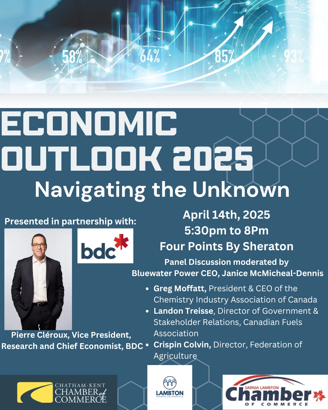 The Chamber is proud to present, in partnership with BDC, the Chatham-Kent Chamber of Commerce, and the Lambton Business Collaborative, this event offers a deep dive into the economic trends, business challenges, and opportunities shaping 2025.