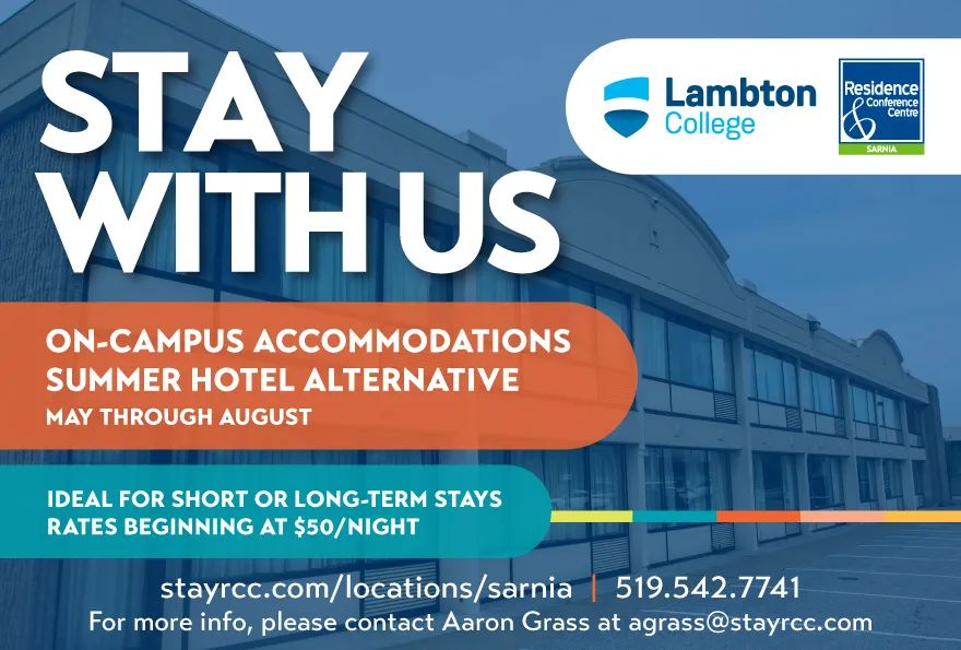 Residence & Conference Centre – Sarnia, located at Lambton College Residence, is an affordable hotel alternative, with two bed suites, complete with kitchenette and private bathroom, available May through August. RCC – Sarnia offers all-inclusive rates (beginning at $50/night) and access to common lounges and meeting spaces, making it ideal for individuals, teams, and groups looking for short or long-term accommodations.