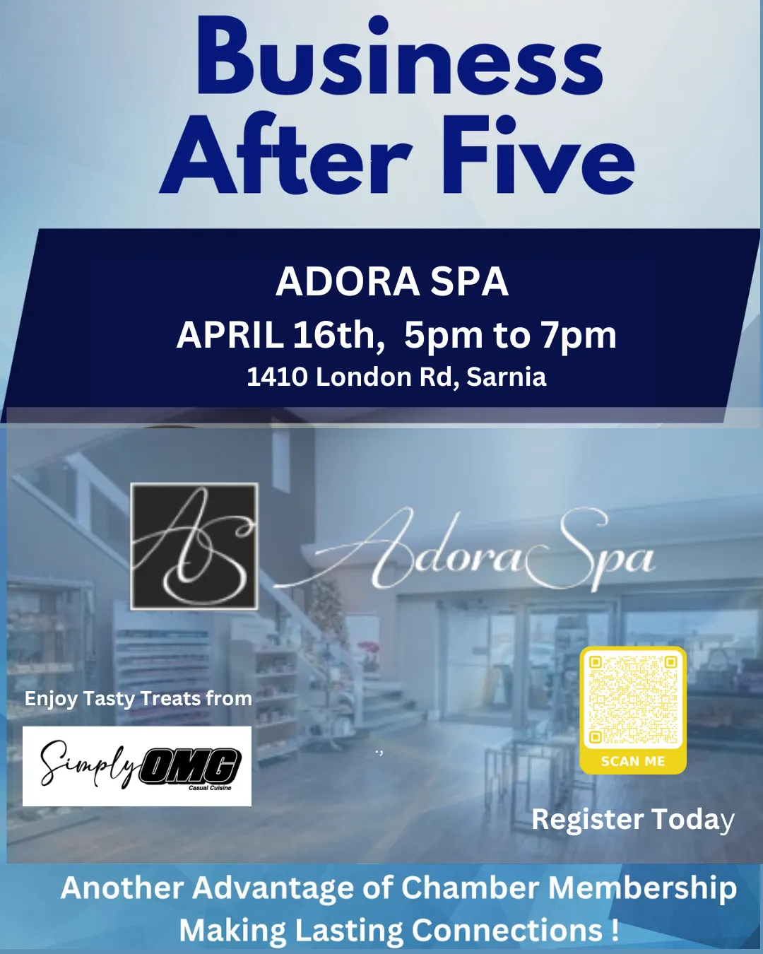 Join us at Adora Spa for April's Business After Five Networking Event! Explore their luxurious spa while connecting with fellow professionals in a relaxed, engaging atmosphere. Attendees will save the tax on Beauty, Skin Care and Boutique purchases!!!