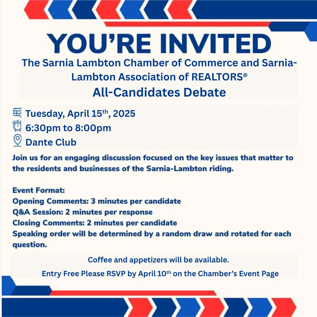 The Sarnia Lambton Chamber of Commerce and the Sarnia-Lambton Association of REALTORS® invite you to an All-Candidates Discussion on Tuesday, April 15th, at the Dante Club. This event provides an essential platform for community members to hear directly from the candidates running in the upcoming election.