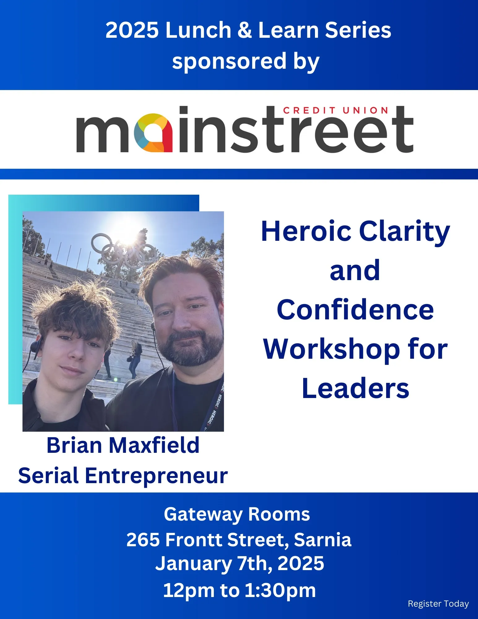 Join us for the 2025 Lunch & Learn, proudly sponsored by Mainstreet Credit Union, featuring Brian Maxfield's transformative Heroic Clarity and Confidence Workshop for Leaders.