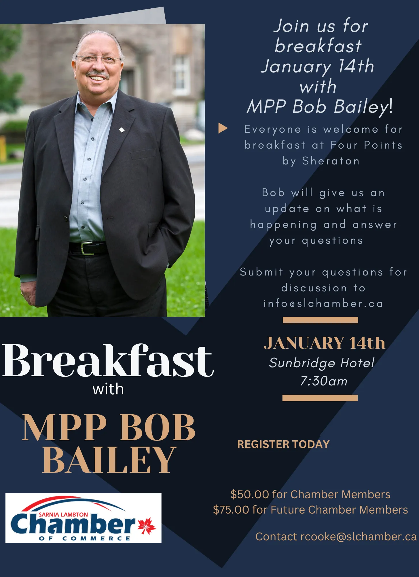 Everyone is Welcome to join us for Breakfast with MPP Bob Bailey!