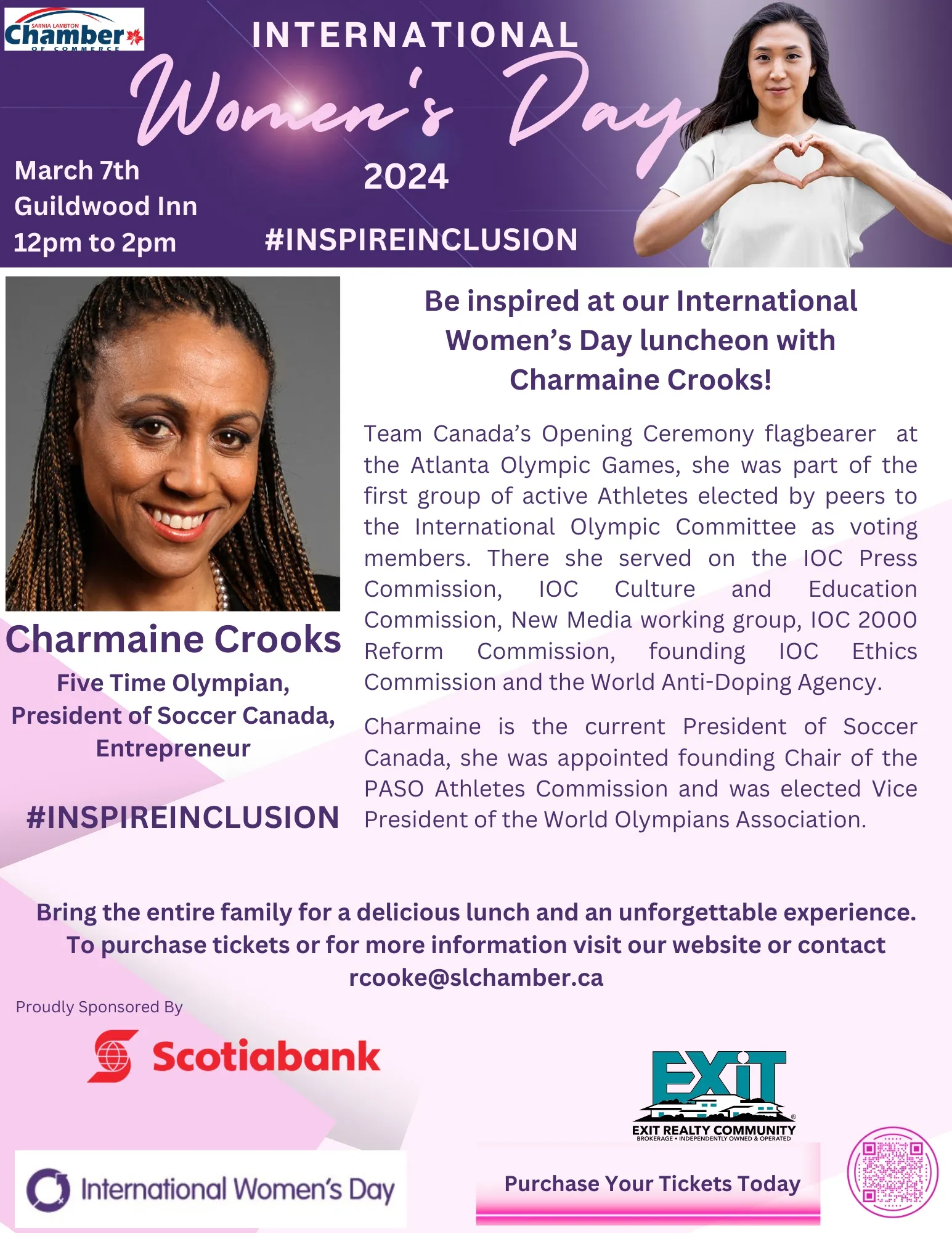 Get pumped for an exhilarating luncheon with the phenomenal Charmaine Crooks, a five-time Olympian, Silver Medalist, President of Soccer Canada, and a dynamic entrepreneur, happening on March 7th, 2024, at our International Women's Day event! Come ready to be thrilled by one of Canada's shining stars at the Best Western, Guildwood Inn. Dive into a delectable lunch and let Charmaine's epic journey ignite your passion and the entire family's!